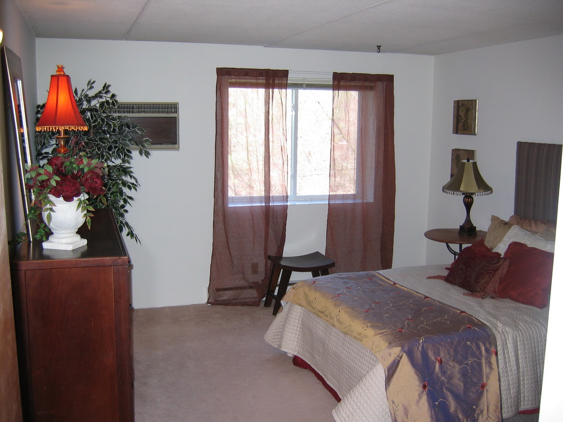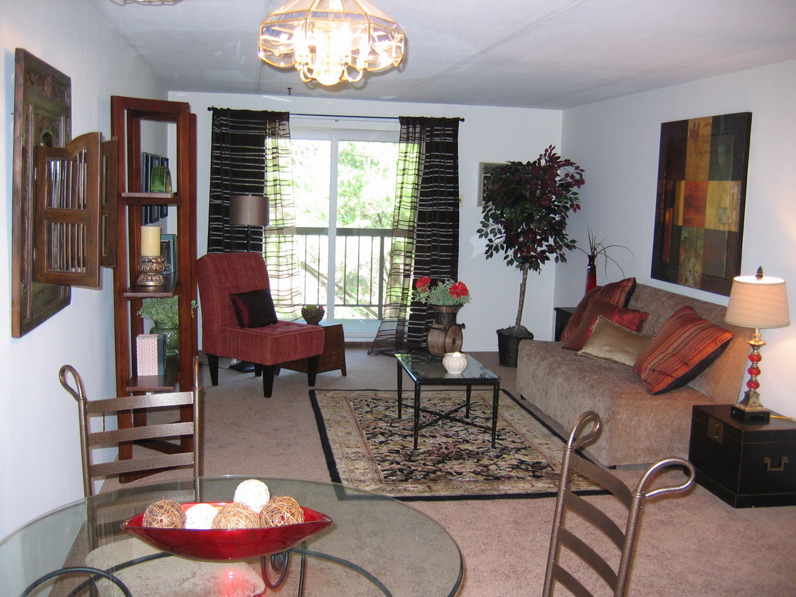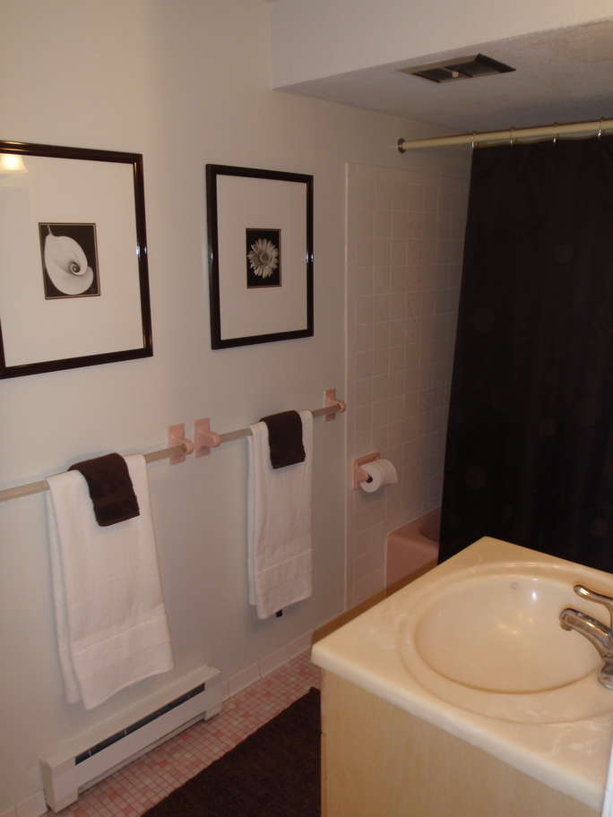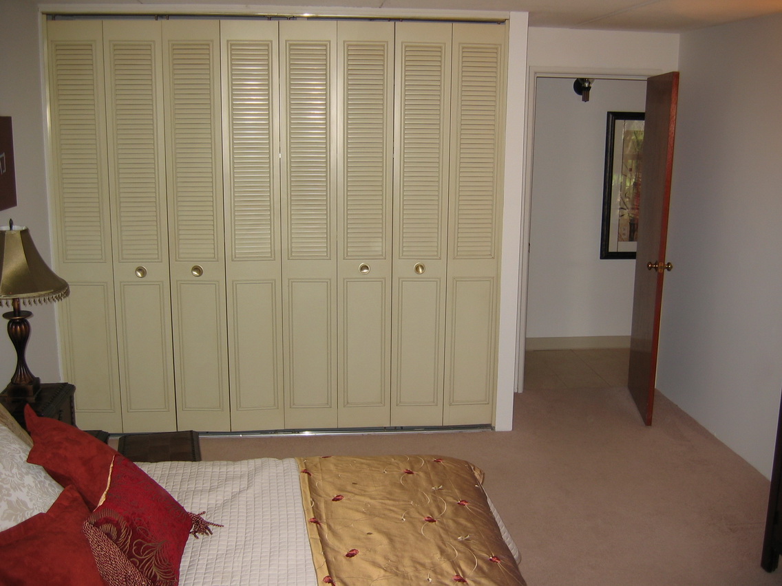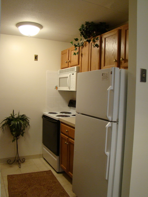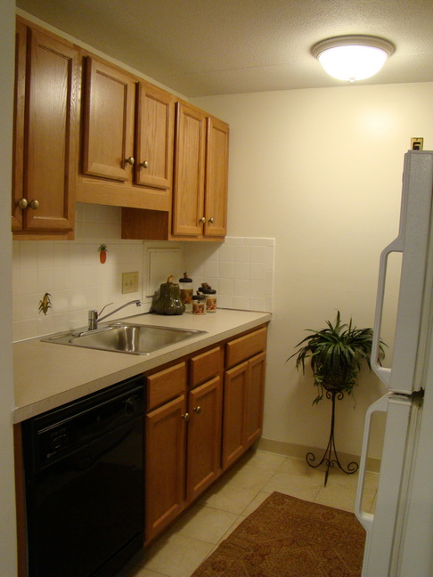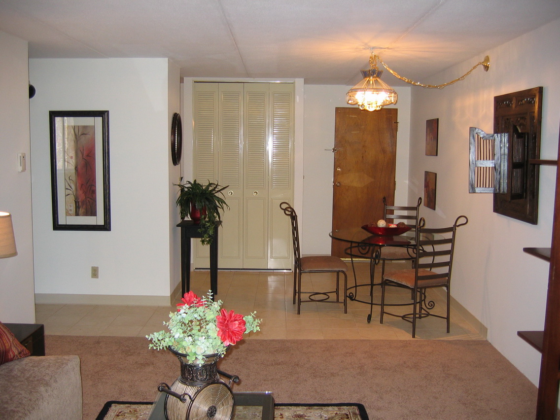 looking back at front door and kitchen on the right (some units updated with tile under eating area).